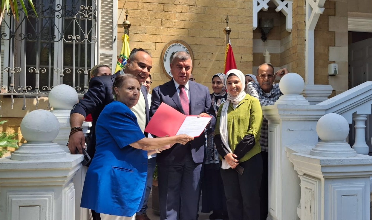 La entrega del documento al embajador Wilmer Omar Barrientos estuvo a cargo de Hayat Elshimi, miembro del Frente de Mujeres Egipcias y presidenta de la Internacional Antifascista (capítulo El Cairo); Amir Abu Rifae, periodista del periódico Elnahar y portavoz de la misma organización, y Amena Abdelrahman, periodista y miembro del Partido Comunista de Egipto.